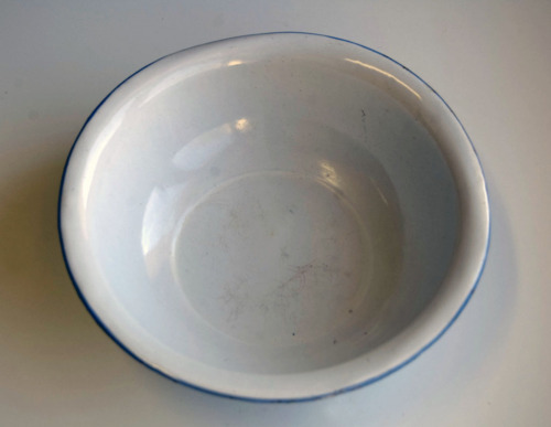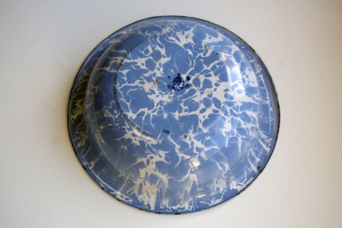 recipiente di forma circolare con sponda alta, svasata e bordo superiore sporgente con spigolo leggermente arrotondato; il diametro della base è la metà del diametro del bordo superiore; in ferro smaltato, di colore bianco all'interno e di colore azzurro a macchie bianche all'esterno; marchio di produzione poco leggibile sul fondoNotizie storico-critiche