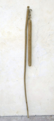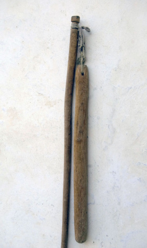 attrezzo costituito da un lungo manico di legno, il manfile (#mànech/ matha/ ferelìn/ ferlìn/ frelìn#), e da un altro bastone di legno più corto e di forma cilindrica, la vetta (#madèrla/ mathòcol/ mathùcol/ vérgola#); le loro estremità superiori sono unite da una legatura, la gombina (#cordógn/ strìnghe#), formata da spaghi di canapa uniti a loro volta da una correggia di cuoio; l'estremità superiore della vetta è provvista di un foro attraverso il quale passa lo spago, mentre il manfile presenta una testa larga a forma di chiodo, attorno alla quale è avvolto lo spago; sulla vetta è incisa la lettera NNotizie storico-critiche