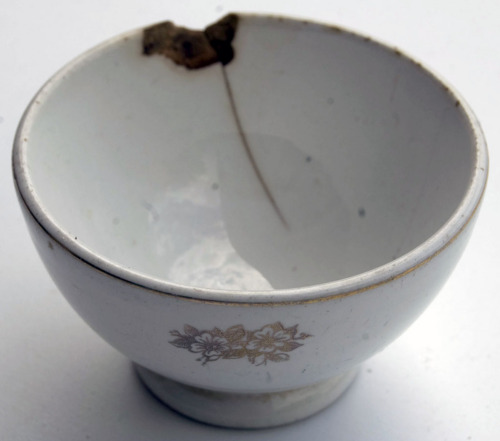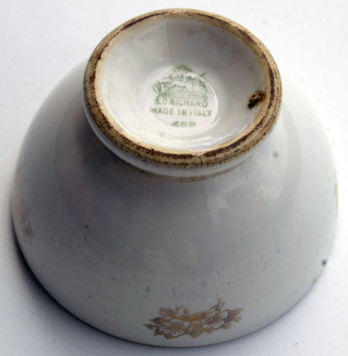 recipiente in porcellana bianca di forma semisferica con bordo arrotondato, poggiante su un piede di forma circolare svasato; il diametro del piede è circa la metà del diametro del bordo superiore. Il bordo superiore è decorato con una linea dorata; sulla superficie esterna vi sono 4 motivi floreali dorati. Sul fondo marchio di fabbricazione stampato in colore verde. Sul bordo superiore vi è una scalfittura da cui parte una fessurazione verso il fondo della tazzina.Notizie storico-critiche