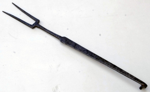 grande forchetta a due rebbi, in ferro, di fattura artigianale; manico piatto con un'estremità assottigliata e sagomata a formare una S; la parte opposta termina con due rebbi sagomati ad U con estremità appuntiteNotizie storico-critiche
