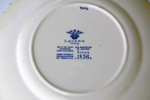 basso recipiente di forma circolare con bordo largo, piatto e leggermente ondulato e svasato. In ceramica bianca, decorata nei toni del blu e ricoperta da una vernice trasparente (terraglia). La decorazione consiste in un fregio a motivi floreali lungo il bordo e in un paesaggio lacustre al centro con pagoda cinese, imbarcazione e personaggi in abiti orientali sulla riva. Scalfitture lungo il bordo. Marchio di produzione sul fondo stampato in blu.Notizie storico-critiche