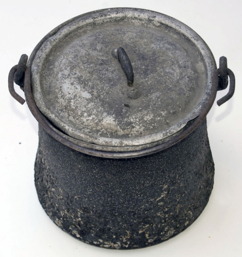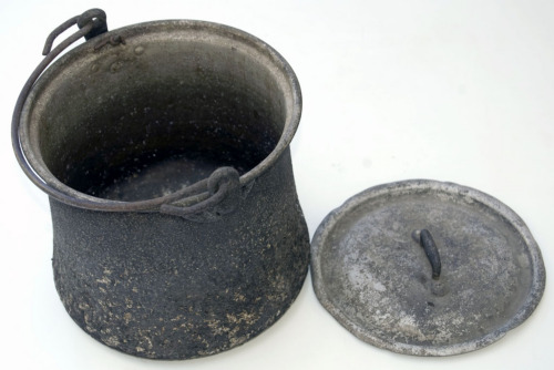 recipiente in ferro con fondo tondeggiante leggermente più largo della bocca e bordo superiore ripiegato; completo di manico in ferro ad arco le cui estremità sono inserite entro placchette sagomate con occhielli forati, fissate con borchie sotto il bordo della pentola. Oggetto completamente coperto di caliggine sulla superficie esterna. Pentola completa di coperchio in alluminio di forma circolare con bordo rialzato e arrotondato; dotato di manico in ferro di forma rettangolare fissato al centro della calotta con borchie.Notizie storico-critiche