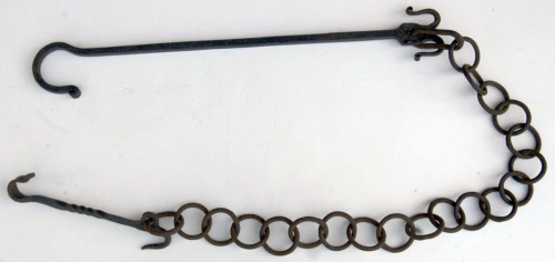 oggetto in ferro battuto costituito da due stanghette di ferro dritte e di una catena, formata da grandi anelli di ferro. La stanghetta superiore presenta un gancio ad un'estremità ed all'altra estremità due gancetti e un foro entro cui è fissato il primo anello, ovalizzato, della catena. L'altra stanghetta, attorcigliata al centro, presenta un gancio ad entrambe le estremità e una protuberanza con un foro entro cui è fissato l'anello finale della catena.Notizie storico-critiche