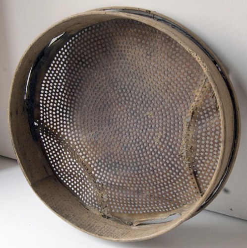 strumento costituito da una fascia circolare di legno, le cui estremità sono fissate con chiodi, alla quale è assicurato il fondo di pelle forata, formato da tre pezzi cuciti tra loro con spago di canapa (che sostituisce probabilmente le cuciture in pelle originali); il bordo del fondo in pelle è fissato mediante chiodi lungo il margine inferiore esterno della fascia di legno; sopra il bordo è fissata, sempre mediante chiodi, un'altra fascia di legno di rinforzo, più bassaNotizie storico-critiche
