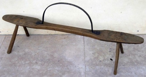 panca lunga e stretta, con estremità arrotondate e restringimento centrale, poggiante su 4 piedi (2 ad ogni estremità) divaricati verso l'esterno; sopra il restringimento centrale è posto un elemento di ferro a forma di arco, le cui estremità sono fissate alla panca con 3 viti di ferro ciascunaNotizie storico-critiche