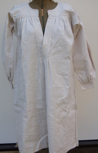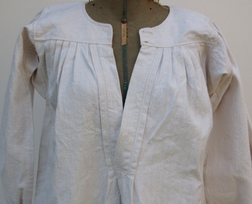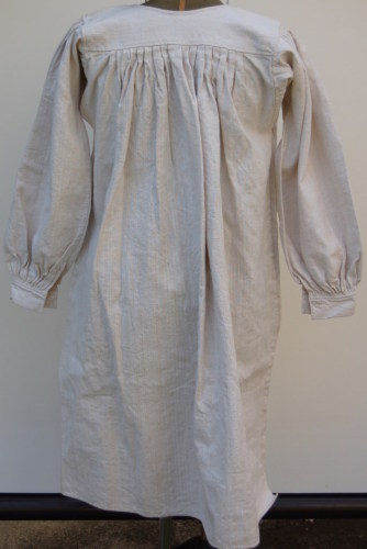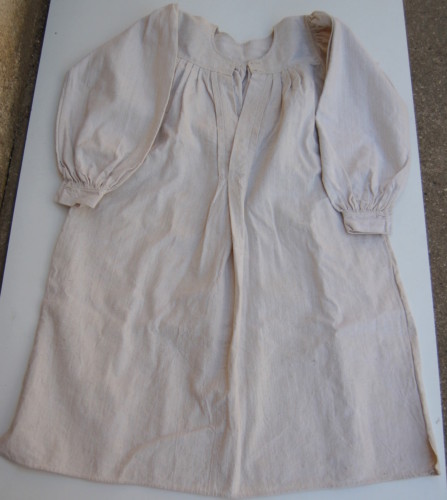 lunga camicia in canapa bianca #tela da ninziòi# con scollo tondo e apertura sul davanti lunga 30 cm e abbottonatura ad asole, i bottoni non ci sono. Caratterizzata da un carrè presso il quale il tessuto si arriccia irregolarmente (in prossimità delle maniche) e si modella a piegoline (sul davanti e sul retro)