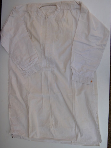 di colore bianco, fattura lunga, linea dritta con spacchi laterali e retro #scoàt de la camìsa# leggermente più lungo rispetto al davanti. Scollo tondo e colletto a fascetta #roetìn, reotìn, ruetìn# chiuso da un piccolo bottone #botòi# in plastica madreperlata, sotto il quale parte un'apertura lunga 39 cm che funge anche da decorazione. Caratterizzata da un carrè sottile attorno al quale il tessuto si modella attraverso molteplici arricciature irregolari #(i)ngiédi#. All'altezza dei polsi le maniche presentano due spacchi chiusi da due bottoncini di colore giallognolo