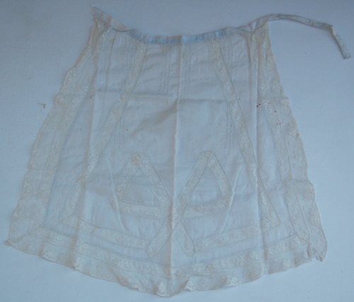 probabilmente recuperato da un vecchio grembiule bianco da balia. Di forma trapezoidale, caratterizzato da un cinturino corto, da tre gruppi di riprese funzionali e decorative sul davanti e dallaggiunta di strisce di pizzo bianco. Queste si trovano sia lungo tutto il margine esterno, su due fasce adiacenti; sia sul davanti dove, seguendo la forma del grembiule, vanno poi a comporre un fiocco nella parte centrale inferioreNotizie storico-critiche