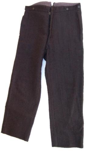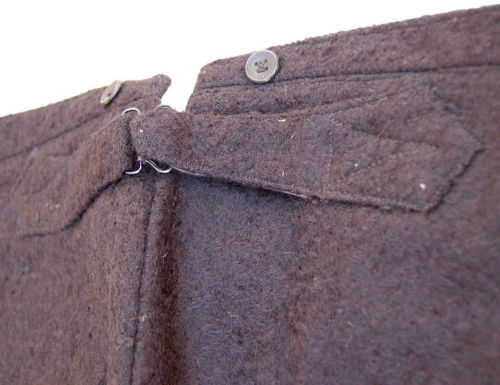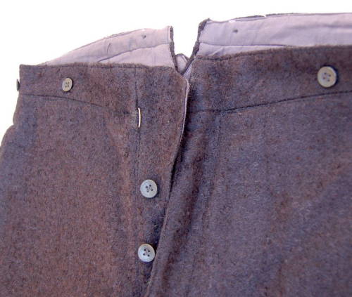 cintura caratterizzata da sei bottoni #botòi# di plastica nera - quattro sul davanti, a lati, e due dietro, in prossimità di un piccolo spacco centrale per agganciarci le bretelle #tiràche#. Abbottonatura #botéga# coperta, con tre bottoni e un gancio finale. Sul retro, appena sotto la cintura, è presente un cinturino con fibbia #fiùba# metallica che ne regolava lampiezza. La fodera #fòdra# in cotone, di colore grigio-viola, è stata applicata allinterno della cintura e sul davanti, fino al cavallo #cavalòt#