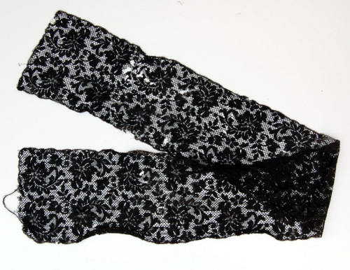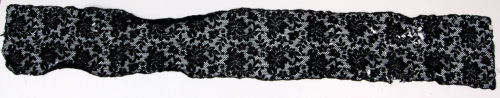In filo di cotone nero, di forma rettangolare, presenta un ricamo a motivo floreale. Il bordo per tutta la lunghezza ha un motivo a lobi appena accennati.Notizie storico-critiche