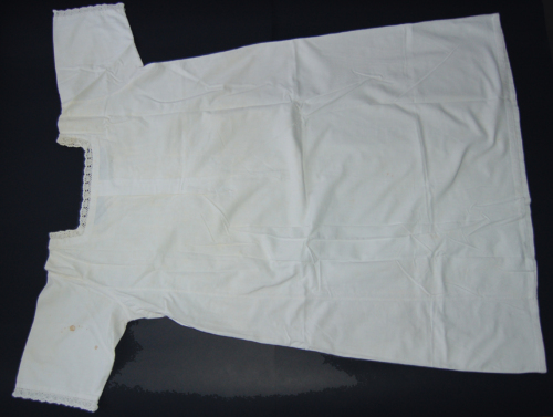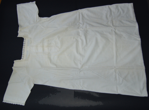 In cotone bianco a maniche a trequarti. Sul davanti presenta unapertura con abbottonatura ad asole. E presente un solo bottone (gli altri mancano) di plastica bianca. Lo scollo è di forma quadrata, su questo è applicato a mano un merletto fatto a macchina. Lo stesso merletto si trova anche sulla zona dellabbottonatura e sulle maniche. Sul carré, lateralmente rispetto alla zona dei bottoni, sono presenti quattro pieghette a destra e quattro a sinistra. Dietro è presente una grande ripresa centrale che parte da sotto il carré.Notizie storico-critiche