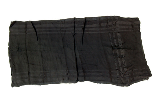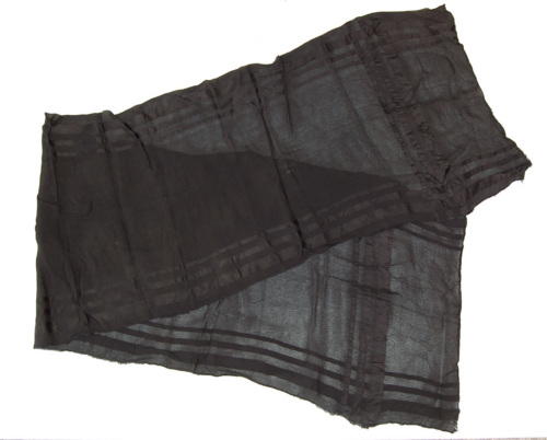 Di forma rettangolare. In seta nera, ha il bordo rifinito con cuciture a mano. Il tessuto presenta un motivo con tre linee verticali parallele allestremità di ciascun lato (lato corto).Notizie storico-critiche