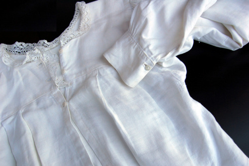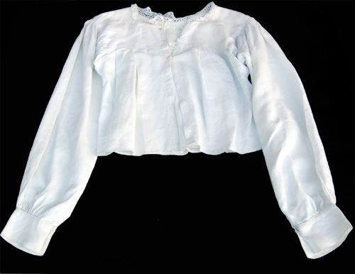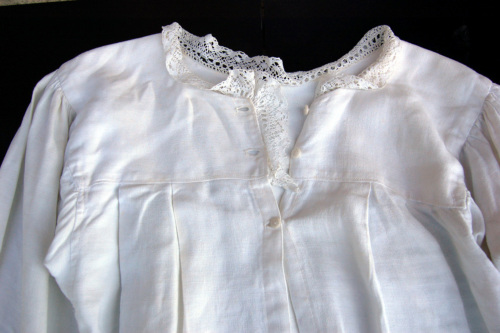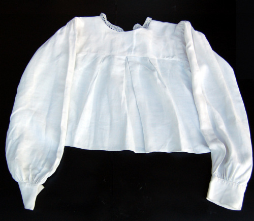 In cotone bianco a maniche lunghe. L'abbottonatura femminile a vista è davanti. I bottoni sono tre, di plastica bianca, così come quelli (due in totale) presenti sui polsini a fascetta delle maniche. Sullo scollo e sullabbottonatura è stato applicato a mano un merletto. Sotto il carré ci sono tre riprese che creano un arricciatura. Nella zona delle spalle è presente un arricciatura. Nella zona dellascella è applicato un tassello quadrato per dare più mobilità al braccio.Notizie storico-critiche