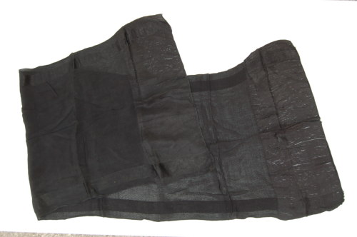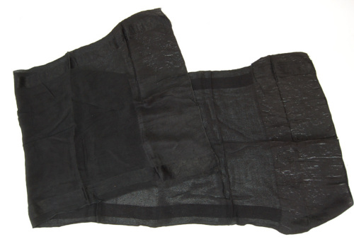 In seta nera. Il bordo è rifinito con cuciture a macchina. E' formato da due pezzi di stoffa uniti ( verticalmente sul lato più corto)da una cucitura a macchina. Il tessuto ai lati presenta due fascette di colore nero più intenso.Notizie storico-critiche