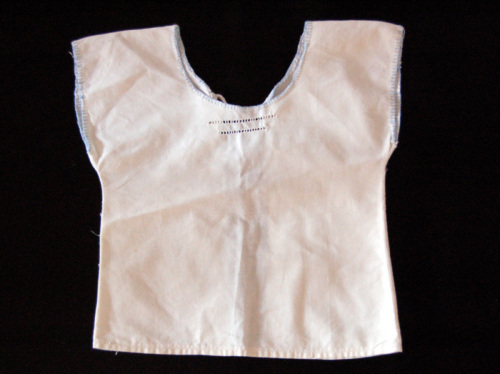 In cotone bianco aperto dietro con chiusura formata da quattro laccetti. Sullo scollo e sul giromanica cè una smerlatura a punto quadro con filo azzurro. Dietro, sotto lo scollo, è presente un motivo geometrico ad orlo a giorno doppio.Notizie storico-critiche