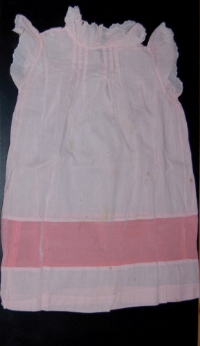 In cotone rosa. Confezionato tutto a mano. Le cuciture e i ricami floreali sono stati eseguiti con filo di cotone bianco. L'abbottonatura a vista è sul davanti ed è formata da cinque bottoncini di plastica bianca, le asole sono ricavate da pezzi di cotone bianco. Sul carré è stata inserita una striscia sottile di cotone bianco che percorre orizzontalmente il vestito interrompendosi vicino alla chiusura. Da sotto il carré parte una leggera arricciatura presente anche sulle maniche corte, ornate da motivi floreali, che terminano a punto festone. Dietro, sullo scollo, ci sono sei riprese che creano unarricciatura. Circa a tre quarti del vestito verso la fine è stata inserita una striscia di stoffa rosa (che lo percorre orizzontalmente) più scura, probabilmente di cotone misto seta.Notizie storico-critiche