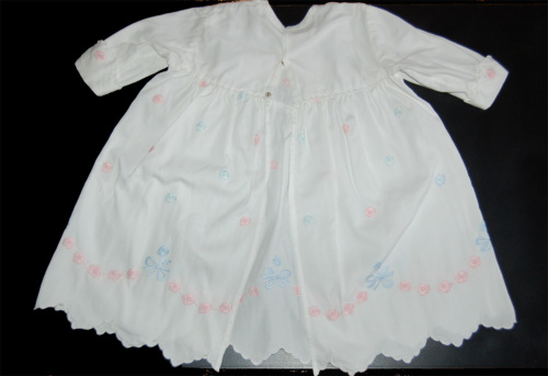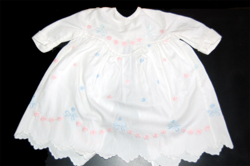 In cotone bianco con ricami floreali e fiocchi di colore rosa e celeste. Produzione industriale. La chiusura sul retro è formata da tre bottoncini di plastica a pressione. Dal carré parte un'arricciatura. Il vestito termina con lorlo a punto festone. Le maniche, corte, presentano un risvolto terminante a punto festone.Notizie storico-critiche