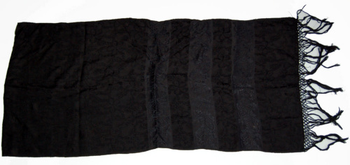 In seta nera con ricamo floreale, tipo damascato. Alle due estremità termina con delle frange annodate in modo da creare un motivo a quadrati.Notizie storico-critiche