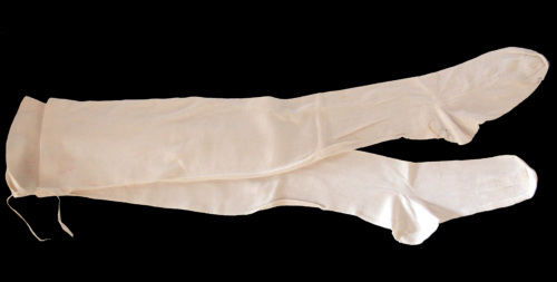 In cotone bianco. Due laccetti posti sull'apertura. Assemblate a mano. Su una delle due calze, in alto a punto croce in filo rosso, sono ricamate due lettere: I P e sotto a queste il numero 21.Notizie storico-critiche