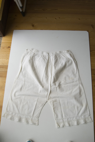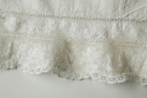 lino (taglio/ cucitura a macchina/ ricamo) / madreperla (lavorazione industriale)