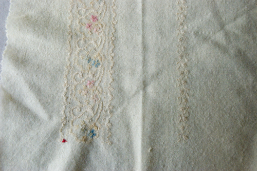 Fazzoletto da testa bianco in lana con una bassa frangia ottenuta dalla sfilatura del tessuto. Cinque fasce ricamate a fiori.Notizie storico-critiche