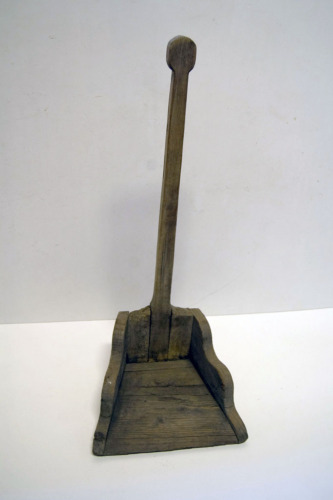 oggetto composto da tavole in legno, costituito da una paletta a base trapezoidale con due sponde laterali sagomate con profilo ondulato e da lungo manico a sezione rettangolare con estremità superiore arrotondata. Parti assemblate e fissate con chiodi in ferro.Notizie storico-critiche