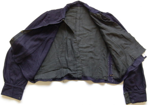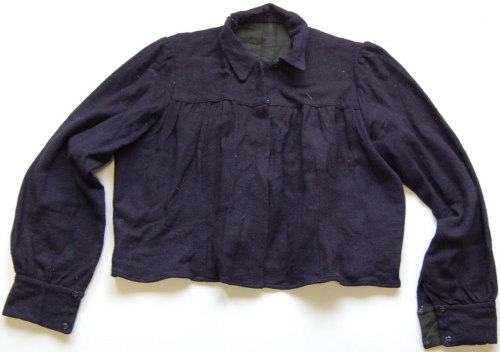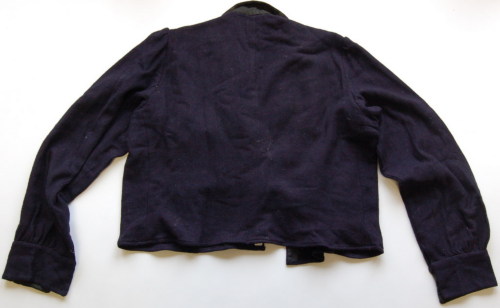 di colore blu; scollo tondo e carrè sul davanti con arricciatura della stoffa sottostante; abbottonatura semplice tramite 5 bottoncini a pressione posti nella parte interna; abbottonatura della fodera nera tramite 10 gancetti metallici; maniche con polsini.Notizie storico-critiche