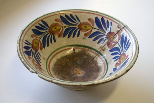 recipiente di forma circolare con bordo alto svasato e spigolo arrotondato; il diametro del piede è circa un terzo del diametro del bordo superiore; in terracotta smaltata allinterno di bianco; decorazione interna a motivi floreali di colore blu, rosso e giallo; due linee parallele verdi e rosse lungo il bordo superiore e sul fondo; fondo interno privo di smalto; oggetto spezzato in due parti di grandezza pressoché uguale.Notizie storico-critiche