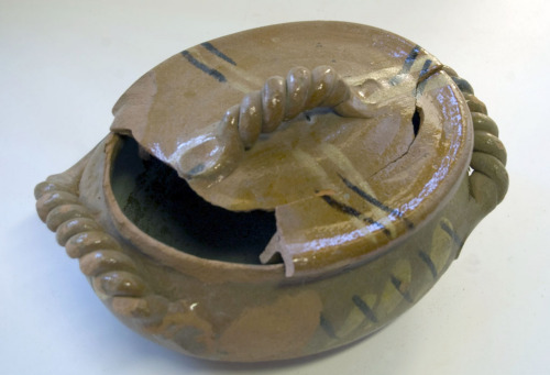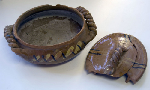 recipiente in terracotta smaltata, a sezione ovale con fondo piatto, pareti panciute, bordo arrotondato e sporgente. Dotato di due manici contrapposti e attorcigliati sotto il bordo superiore. Decorazione pittorica astratta in colore giallo e marrone scuro lungo le pareti e sui manici. Recipiente completo di coperchio a sezione ovale in terracotta smaltata e decorata a linee gialle e marroni; al centro, manico attorcigliato. Il coperchio è spezzato in due parti e mancante di una parte ulteriore.Notizie storico-critiche