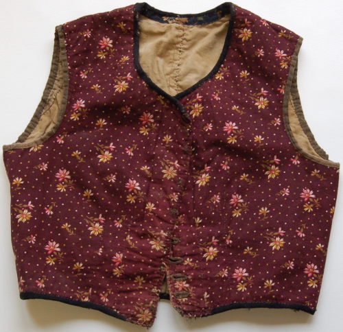 caratterizzato da una stoffa con motivi floreali gialli, rosa e verdi su sfondo violaceo. Scollo tondo e abbottonatura semplice tramite 9 bottoni #botòi#. Collo e bordo inferiore bordati con una fettuccia nera; maniche bordate con cotone marrone. Fodera beige e falde interne realizzate con ritagli di stoffe di diversa fantasia. Viste le numerose cuciture, si può dire che il panciotto sia stato realizzato attraverso il riutilizzo di alcuni scampoli scartati dalla produzione di altri vestiti.
