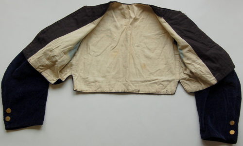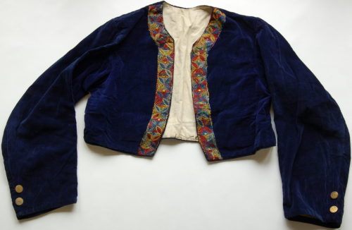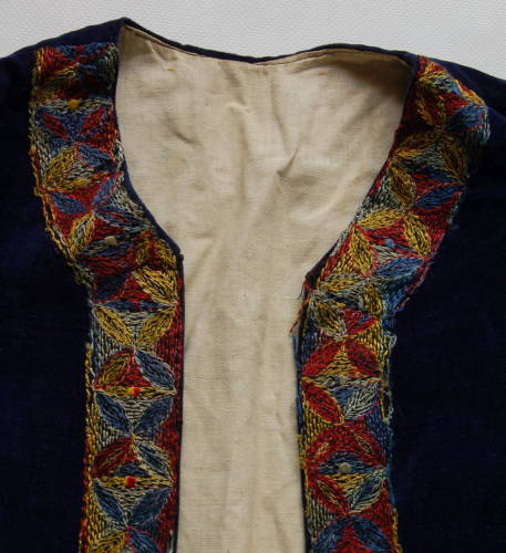 scollo tondo e apertura sul davanti senza bottoni, leggermente arrotondata verso il fondo e decorata da una fascia con ricami floreali stilizzati di colore blu, giallo, rosso e bianco. All'interno è applicata una stoffa nera come rinforzo. Dietro ci sono due piccoli spacchi laterali e ai polsi due bottoni #botòi# dorati.
