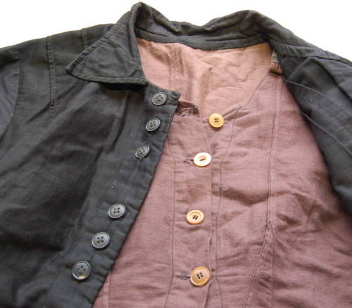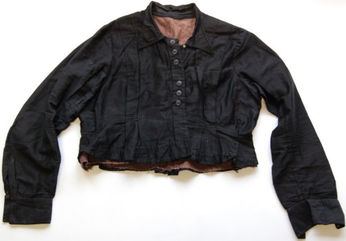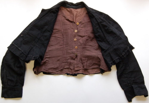 di colore nero; scollo tondo e abbottonatura semplice tramite 4 bottoncini #botòi# a pressione posti nella parte interna. Caratterizzato da alcune cuciture longitudinali decorative (4 lunghe sul davanti e 2 piccole sul retro) che vanno ad arricciare il bordo inferiore del corpetto. Fodera di colore marrone con riprese e chiusa sul davanti da 5 bottoni #botòi# uno diverso dall'altro. Maniche con polsini.Notizie storico-critiche