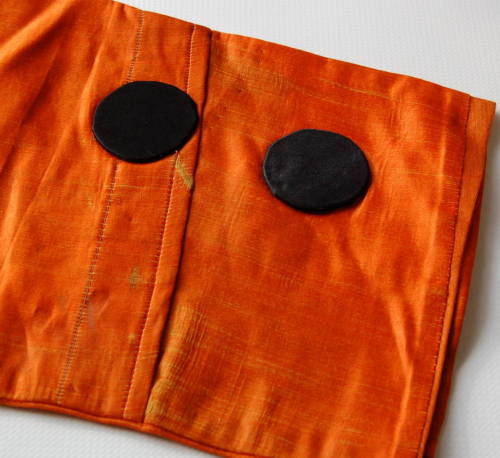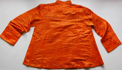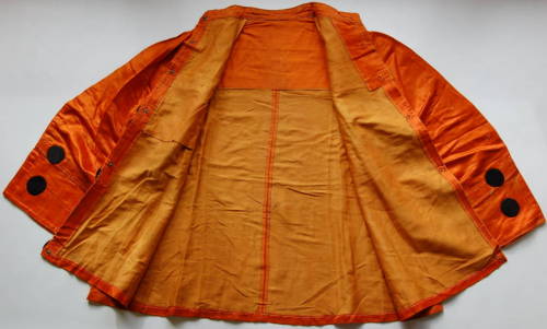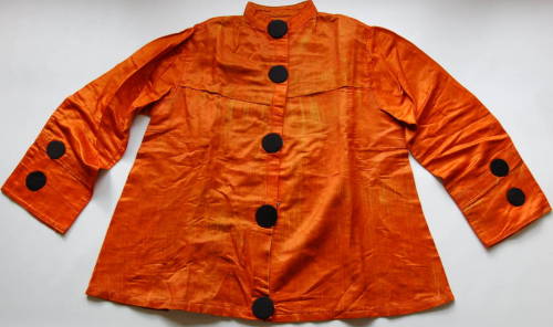 scollo tondo, colletto a fascetta e carrè davanti e dietro. Da sotto le ascelle partono due riprese laterali che si allungano verso il petto. Abbottonatura sul davanti tramite sei bottoni a pressione cuciti nella parte interna, mentre sul davanti ci sono cinque grandi bottoni rivestiti di cotone nero. Due di simili si trovano anche ai polsi, dove la stoffa è stata ripiegata e cucita con funzione decorativa.