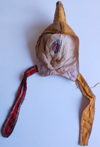 fasce di stoffa gialle e verdi (due per lato) decorate da una fettuccia con filamenti dorati sovrapposta alle cuciture laterali e la bordatura inferiore. Corno riempito di ovatta e piegato in avanti. Piccolo spacco sul retro. Ai lati ci sono due grandi bottoni #botòi# rivestiti in stoffa dai quali partono due fasce (a destra rossa e a sinistra gialla)decorate anch'esse con la stessa fettuccia. Fodera in cotone bianco tranne dietro i bottoni dove è in cotone rasato lilla. Al centro della fodera è stata cucita una stoffa con disegnato il marchio del cappello dal quale è stata riciclata. Il berretto viene fissato alla testa grazie ad un elastico.Notizie storico-critiche