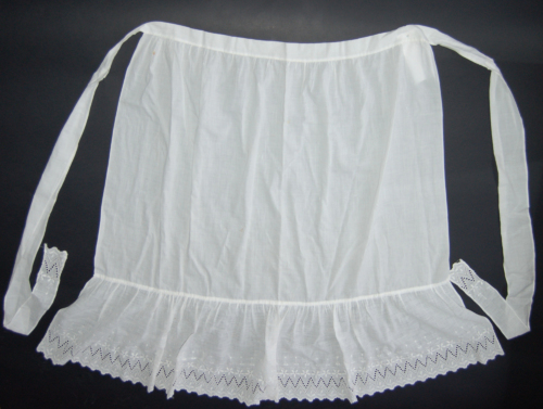 Formato da sette pezzi di cotone bianco assemblati a mano. La cintura è composta da una fascia centrale e due fasce laterali a destra e due a sinistra, alle cui estremità è presente un ricamo floreale a punto pieno e geometrico traforato. Entrambi terminano a punto festone così come il bordo inferiore del grembiule nel quale si ripete lo stesso ricamo. Questo è unito al grembiule tramite una cucitura ricoperta posteriormente da una fettuccia di cotone bianco. In questa zona sono presenti numerose arricciature.Notizie storico-critiche