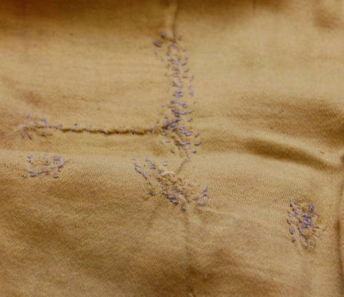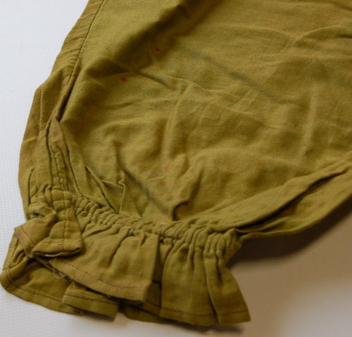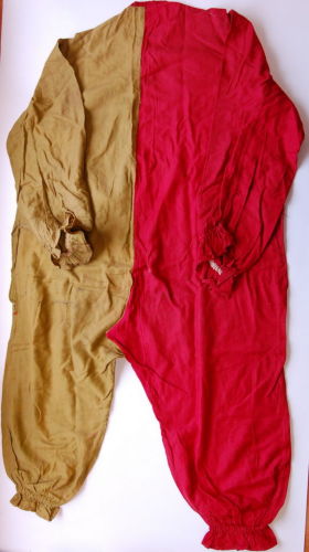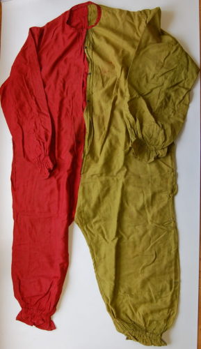 realizzato con due stoffe di diverso colore: la parte sinistra è verde, mentre la destra è rossa. Scollo tondo con bordatura rossa. Abbottonatura sul davanti tramite cinque bottoni a pressione cuciti internamente. I polsini e i bordi inferiori delle gambe, che arrivano fino a metà polpaccio, sono arricciati da degli elastici. Ai lati, lungo i fianchi, all'altezza della vita, ci sono due aperture che forse permettevano alla persona di accedere alle tasche dei pantaloni sotto.