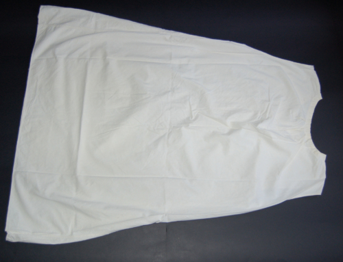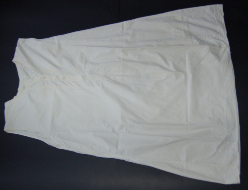 Lunga camicia in cotone bianco senza maniche con scollo a v e apertura sul davanti con abbottonatura, femminile a vista, composta da tre bottoni di plastica. Termina scampanata. Sul davanti in basso sono presenti tre toppe. E'assemblata tutta a macchina solo le toppe sono cucite a mano. Al centro, sullo scollo,(dietro) sono presenti quattro riprese che formano una piccola arricciatura.