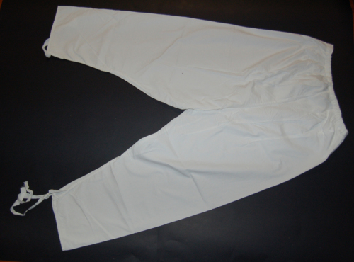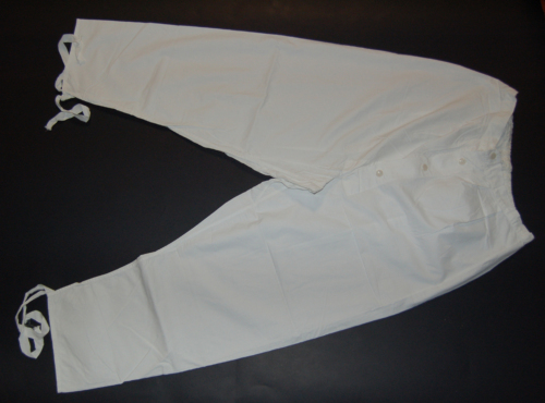 Di cotone bianco, lunghe. Davanti al centro è presente un'abbottonatura maschile, a vista, con quattro grandi bottoni di plastica. Ai lati di questa, ci sono quattro riprese, due a destra e due a sinistra. Nella parte posteriore, in vita, c'è un elastico. I gambali terminano con due spacchetti nei lati e una chiusura con due laccetti di cotone.