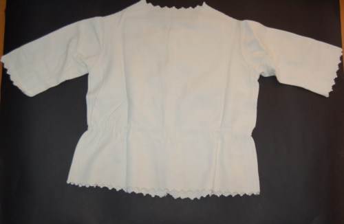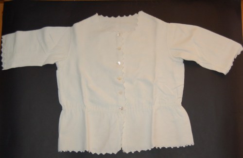 In cotone operato, felpato bianco, è assemblato a macchina. La chiusura, sul davanti, è composta da un'abbottonatura, femminile a vista,( formata da cinque bottoni in plastica bianca) e da un cordone di cotone che se tirato stringe il corpetto in vita. Lo scollo è a girocollo smerlato a punto festone. Il punto festone è presente anche sull'orlo delle maniche a trequarti e sulla zona dell'abbottonatura.Notizie storico-critiche