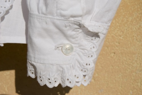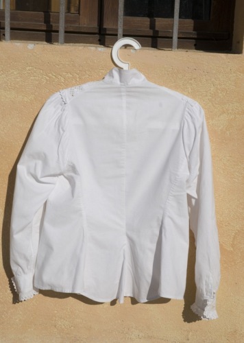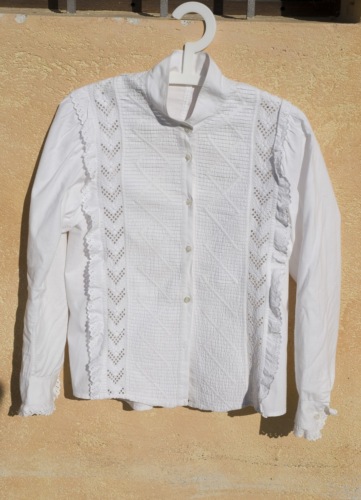 camicia in lino bianco. L'abbottonatura femminile a vista è davanti. I bottoni sono cinque di madreperla. Presenta colletto alla coreana chiuso da un bottone in madreperla uguale agli altri. Sul davanti della camicia il tessuto è lavorato a strisce orizzontali e rombi e sui bordi è applicato un pizzo di sangallo in cotone, il medesimo pizzo si trova sui polsini, che sono chiusi ciascuno da un bottone.Notizie storico-critiche