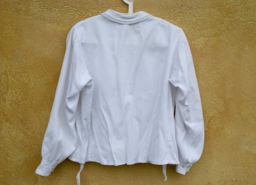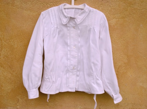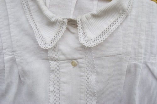 camicia in cotone piquet rigato bianco con piccolo colletto a punta bordato da un basso (1.5 cm) pizzo all'uncinetto. L'abbottonatura femminile a vista è davanti. I quattro piccoli bottoni sono di madreperla. Sul davanti dalle spalle scendono per 13 cm tre pieghette con conseguenti pinces. Sul dietro ci sono tre pinces all'altezza del collo. I polsini sono foderati con lino bianco e sono chiusi da un bottoncino. All'interno all'altezza della vita sono cucite due fettucce, che, una volta allacciate, fanno aderire la camicia al corpo.Notizie storico-critiche