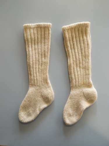 realizzati ai ferri con lana di colore bianco: il gambale è lavorato a costine, il piede a maglia rasata, il bordo superiore è a costine e all'interno vi è stato inserito un elastico.Notizie storico-critiche
