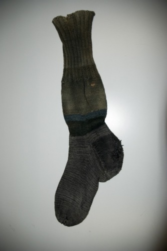 realizzati ai ferri con cotone di colore grigio e verde chiaro: la parte superiore del gambale è lavorata a costine, il resto e il piede a maglia rasata.Notizie storico-critiche