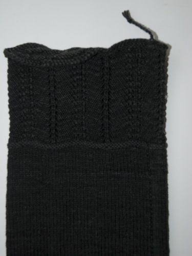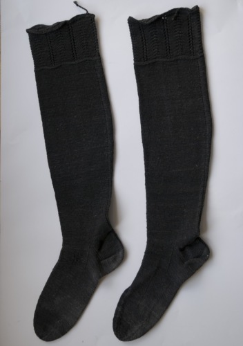 Calze invernali da donna, arrivano sotto il ginocchio. Realizzate con lana grigio scuro lavorata a macchina. Nel bordo superiore c'è una lavorazione decorativa e smerlata con un trecciolina libera.Notizie storico-critiche