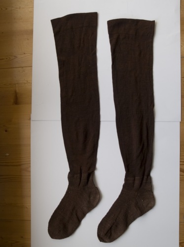 Calze lunghe da donna in lana marrone. Il gambale è realizzato con tessuto di lana di produzione industriale, il piede è in cotone lavorato a maglia rasata a ferri.Notizie storico-critiche