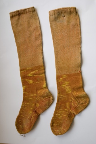 Calze da donna, arrivano sotto il ginocchio. Realizzate con cotone di colore arancione nel gambale e arancione più scuro con fiammature gialle nella parte inferiore del gambale e nel piede. Nel bordo superiore è inserito un elastico.Notizie storico-critiche