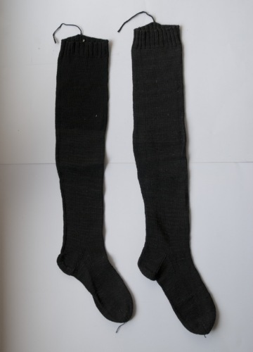 Calze da donna, arrivano sotto il ginocchio. Realizzate con cotone nero lavorato ai ferri. Il bordo superiore è lavorato a coste, il gambale e il piede sono lavorati a maglia rasata.Notizie storico-critiche