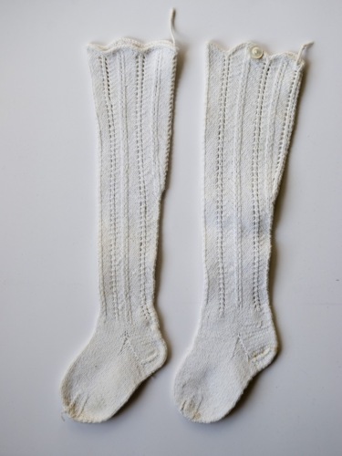 Calzini lunghi da bambino. Realizzati con cotone bianco lavorato a ferri. Il bordo termina con un motivo a cappe, al centro c'è un bottone in madreperla. Il gambale è lavorato con un motivo decorativo. Il piede è lavorato a maglia rasata.Notizie storico-critiche