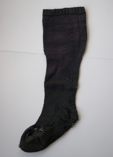 Calza da donna, arriva sotto il ginocchio. E' realizzata con cotone nero lavorato a ferri, il bordo è a coste, il gambale e il piede sono a maglia rasata.Notizie storico-critiche