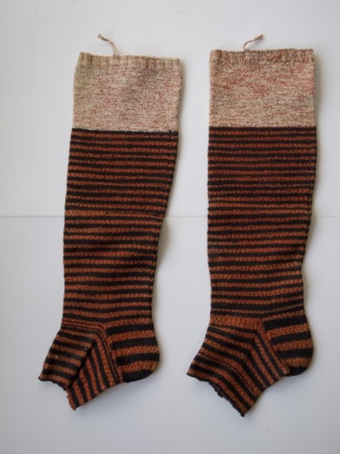Calze da donna prive della punta. Sono realizzate con cotone lavorato a ferri; di colore melange bianco e rosso nel bordo e parte superiore del gambale, a righe alternate rosse e nere nelle parti restanti. Il bordo è lavorato a coste, il gambale e la soletta a maglia rasata.Notizie storico-critiche